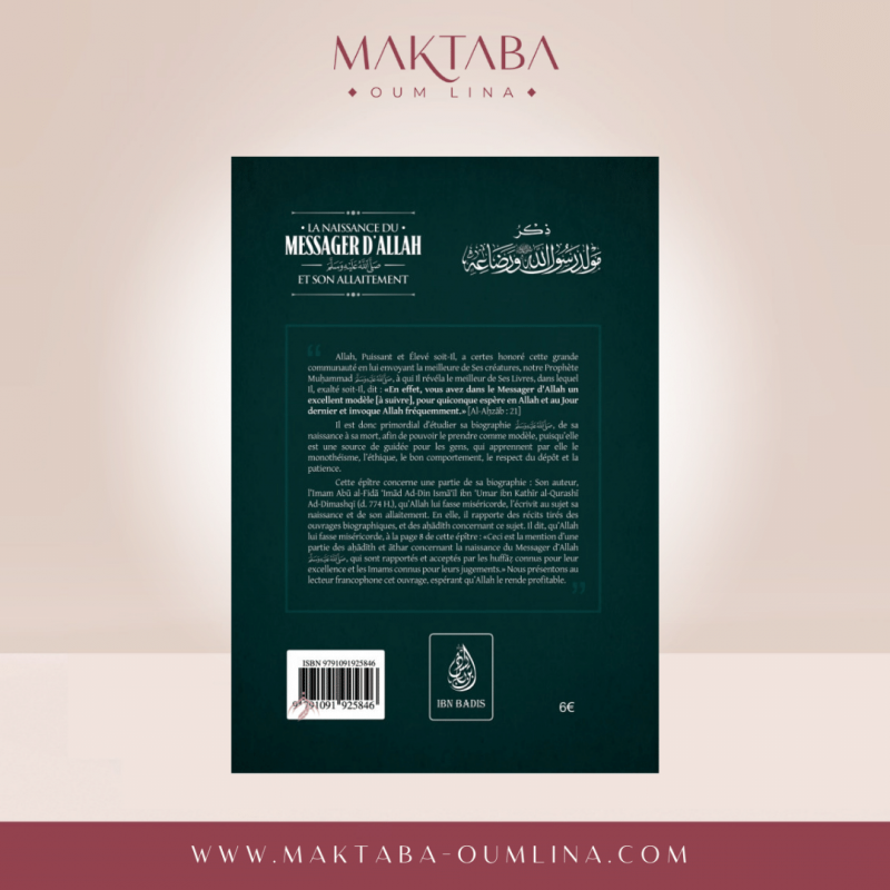 Cette épître concerne une partie de la biographie notre Prophète Muḥammad ﷺ: Son auteur Abū al-Fidā Ad-Dimashqī l’écrivit au sujet sa naissance et de son allaitement. En elle, il rapporte des récits tirés des ouvrages biographiques, et des aḥādīth concernant ce sujet. Il dit, qu’Allah lui fasse miséricorde, à la page 8 de cette épître : « Ceci est la mention d’une partie des aḥādīth et āthar concernant la naissance du Messager d’Allah ﷺ, qui sont rapportés et acceptés par les huffāẓ connus pour leur excellence et les Imams connus pour leurs jugements. » Nous présentons au lecteur francophone cet ouvrage.